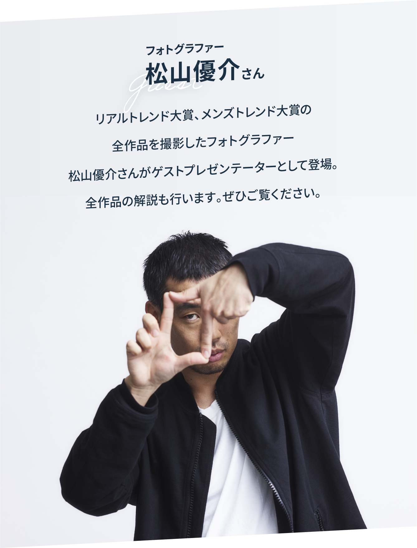 モデルの容姿と雰囲気からクリエイション寄りの撮影がしたいと考えました。イメージしたのはエッジィかつ繊細なテクニックとバランスで勝負する『ヴィラン』。メンズはナチュラルな傾向が続いていますが、その逆を狙いインパクトを盛り込み、色を削ぎ落としモノクロでの世界観を創ることで、より想像の余地を広げてデザイン表現をフルに楽しめる作品を目指しました。裏テーマは今のトレンドワード『ジェンダーレス』、そこにさらに『時間の奥行き』を感じさせるようにとデザインをイメージしました。今(トレンド)と昔をフィックスすることで作品自体に深みが増し、何度も見たくなるような味のある作品にというのが時間の奥行きです。さらにジェンダーレスアイコンとして『デビィッド・ボウイ』のイメージも。性別や時代の垣根を越えた今回のデザインを楽しんで頂けたら幸いです。